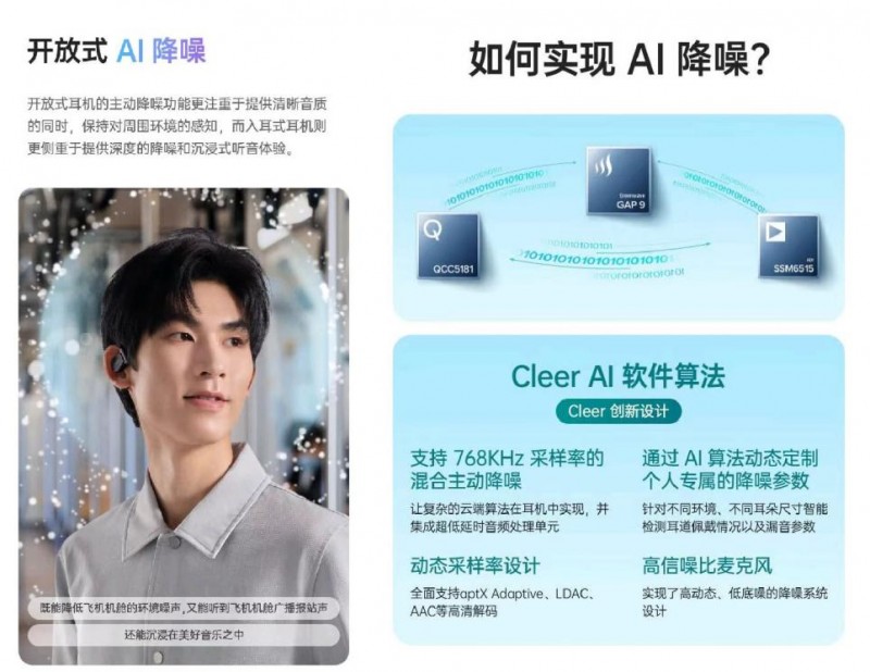 The AI noise reduction function of Cleer can be cleverly combined with its open design. Unlike the traditional in ear and head mounted headphones that provide a "silent on wear" noise reduction experience, the Cleer ARC 3 Sound Arc Noise Reduction Edition achieves "open AI noise reduction", focusing on selectively reducing background noise and improving active noise reduction effects. Users can still maintain their attention to the surrounding environment, giving them a sense of safety when traveling.