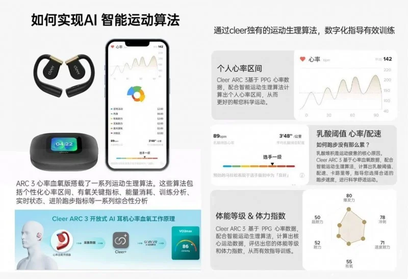 Cleer與全球頂尖專業(yè)運(yùn)動(dòng)科學(xué)及AI智能教練服務(wù)商GoMore緊密合作,共同為ARC 3 音弧 開放式AI耳機(jī) 運(yùn)動(dòng)版Pro搭載了一系列運(yùn)動(dòng)生理算法,能提供包括個(gè)性化心率區(qū)間、有氧關(guān)鍵指標(biāo)、能量消耗、訓(xùn)練分析、實(shí)時(shí)狀態(tài)、進(jìn)階跑步指標(biāo)在內(nèi)的一系列綜合性分析。
